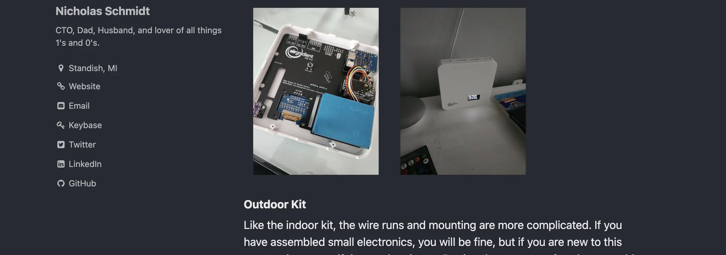 SEEN.team, Central CaliforniaRecently picked up an air quality sensor from AirGradient. Fun kit with out-of-the-box data viz. Can see where I had the window open in the morning which resulted in a significant increase in particulates in the air. AC system later filtered them out.