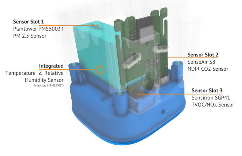 - Measures PM2.5, CO2, TVOCs, NO2, O3, Temperature, Humidity